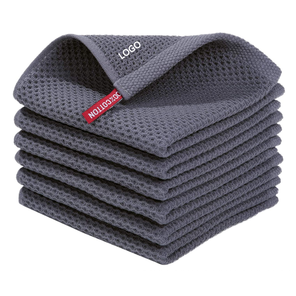 100% cotton waffle weave dishcloths that feels soft and comfortable. Unique honeycombs design makes it more durable, and soften with every washing, so these dish towels won't scratch your delicate cookware, plates and pans. In order to minimize shrinkage, please machine wash with cold water, gentle cycle, tumble dry low. The LOGO is embroidered.