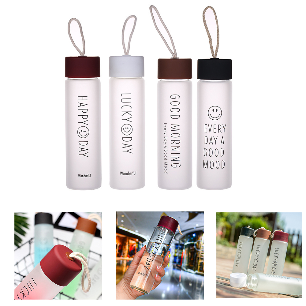 The mug is made of glass, which can be made clear or frosted, and the lid comes in four colors. This cute glass bottle holds 12oz/350ml, the size is 8''H x 2.2'' W, it's very easy to carry. Hemp rope handle, more unique.