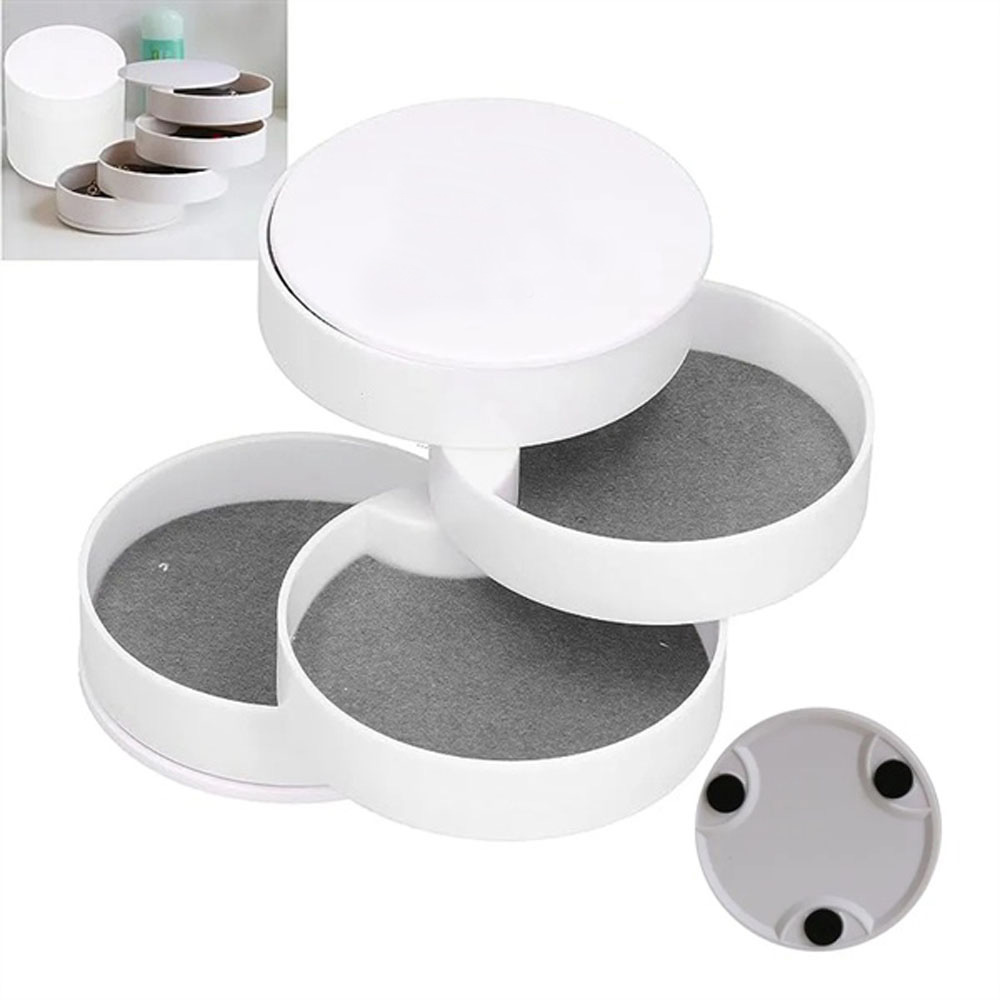 4-layer rotating jewelry tray design, 360 degreen freely rotating round jewelry box. When closed, it is a compact cylinder. The appropriate size will not occupy the space on the desktop, it can also be exquisite decoration. The jewelry box can be a ring holder, earring holder organizer, necklaces, bracelets, watches and other small jewelry holder.
