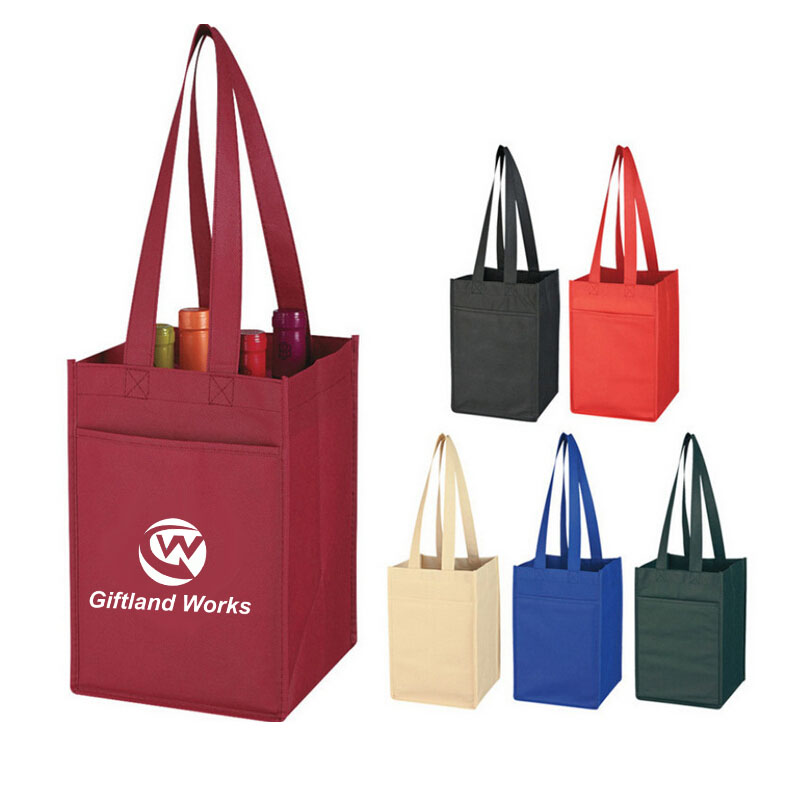 4 bottle wine non-woven tote bag, features reinforced 22" handles, a front pocket, 7" gusset with bottom insert and four divider pockets. Measuring 7" W x 11 3/4" H x 7" D, this bag is made of 100 gram non-woven polypropylene. Recyclable and reusable. Assorted colors for your option. Your artwork can be imprinted on the generous area.