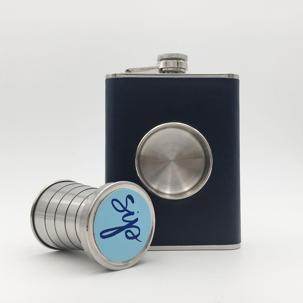 8oz Hip Stainless Flask with Collapsible Cup. Very durable, made with high quality 18/8 Stainless Steel food grade material. Screw down cap attached to the flask so it cannot be lost. The body is covered with PU leather and feels comfortable. You can customize large areas of full-color patterns on the surface.