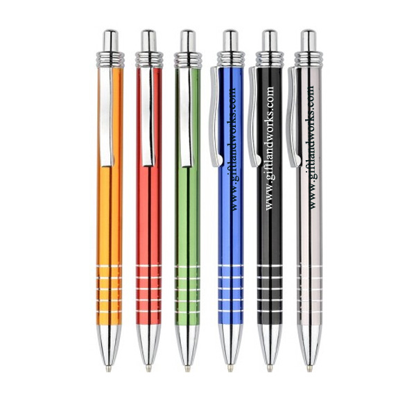 High quality ballpoint pen, made from aluminum pen body and plastic silver plated trims. Laser engraved grip. Your LOGO can be laser engraved or silk screen imprinted on the pen body. Many colors for your option.