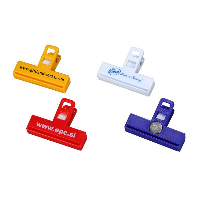 Plastic Bag Clip with magnetic back, length is 3". Seal open bags, keep fresh for your snack, chips, dried fruit and other food. Hold notes and documents. Your message or company LOGO can be exellent exposed on the large space. Many colors for your option.