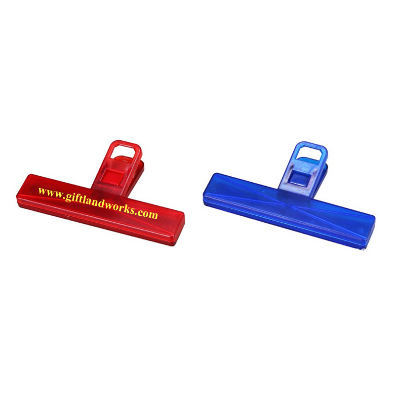 Half transparent plastic bag clip, length is 6". Seal open bags, keep fresh for your snack, chips, dried fruit and other food. Hold notes and documents. Your message or company LOGO can be exellent exposed on the large space. Many colors for your option.