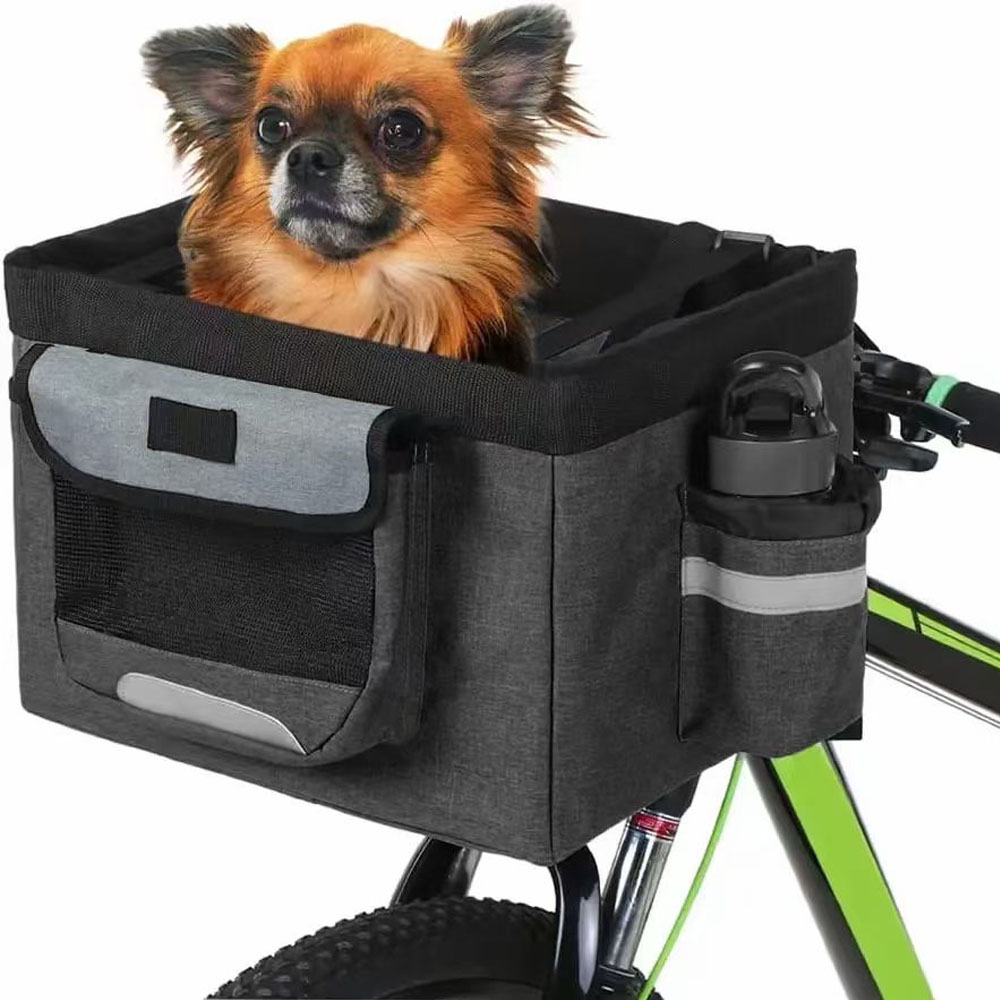 This handlebar cycling bag is made of a sturdy aluminum frame, with a solid oxford fabric. This multifunction bike basket attaches via a quick-release handlebar mount, making removal a snap. When you use it as a dog bike basket. It is easy to disassemble and reassemble for convenience sake, so you can constantly take the bike basket on and off the bike to use it as a pet bed or dog car carrier.Â