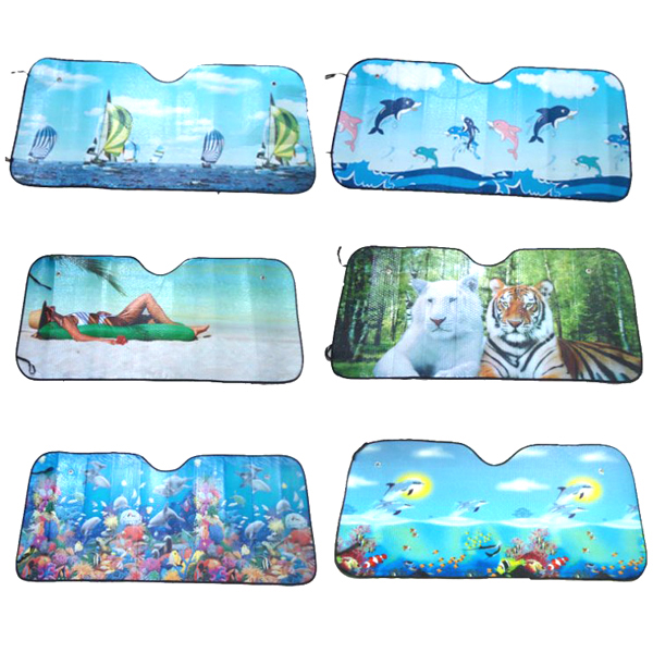 This folding front car sunshade, made from aluminum film and EVA foam, highly reflective and insulated. Your LOGO can be silkscreen or full color imprinted on. accordion fold, held together with built-in elastic straps. Please check the set up charge if you need full color imprinting.