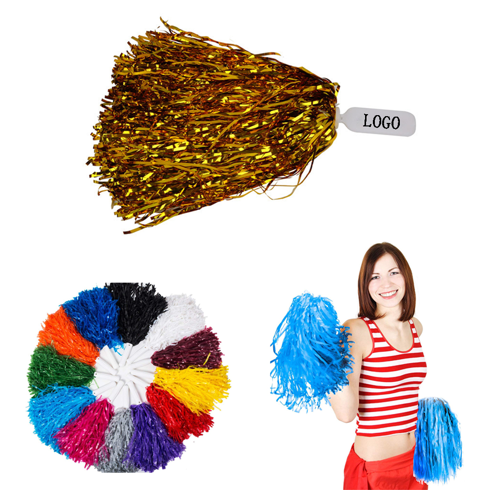 "These cheerleading pom poms are made of soft plastic with a white hard plastic handle. They are durable, reusable, lightweight, and convenient to be held by hands. Proper size for child or adults: the streamer length is 25cm (10inches), the handle length is 10cm (4inches), each pom pom weights about 20g. Serve as cheer accessories, not only for sport cheerleading such as football, basketball, baseball, softball, but also use as party costume accessories in night party fancy dress. You can customize the weight, and your LOGO or artwork can be imprinted on the handle."
