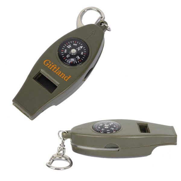 Four function in one product: Whistle, Thermometer, Magnifier, Compass. Spring-loaded clip for attachment to belt or lanyard. Equips adventurers with everything they need to explore the outdoors A spring-loaded clip lets hikers attach the Four Function Whistle directly to their belt, lanyard or backpack. Size is 3 3/20" x 3/4".Your customized LOGO is available.