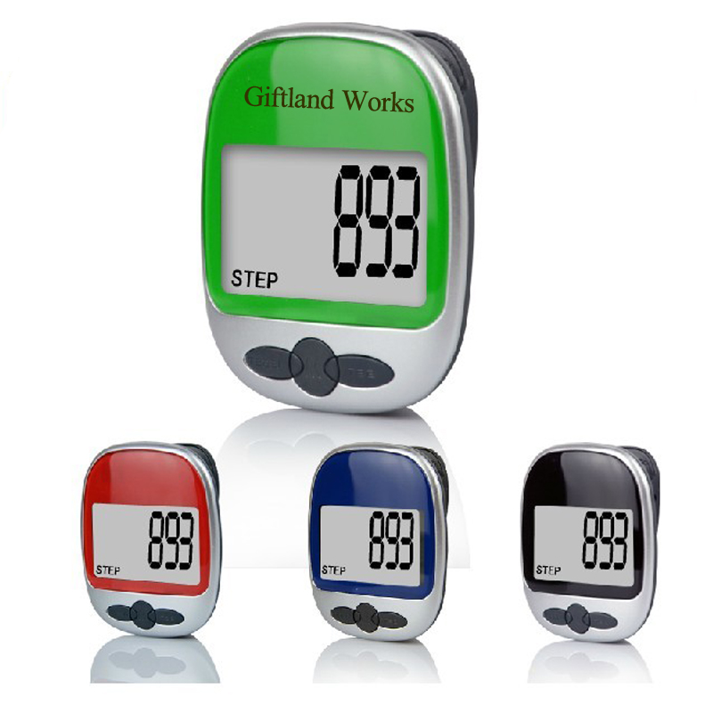 Digital Pedometer with clip. Features three buttons and large screen. Count the total number of steps per exercise activity. Help your promotion in Health Care Stores, Fitness Activities, Sports Event, and so on.