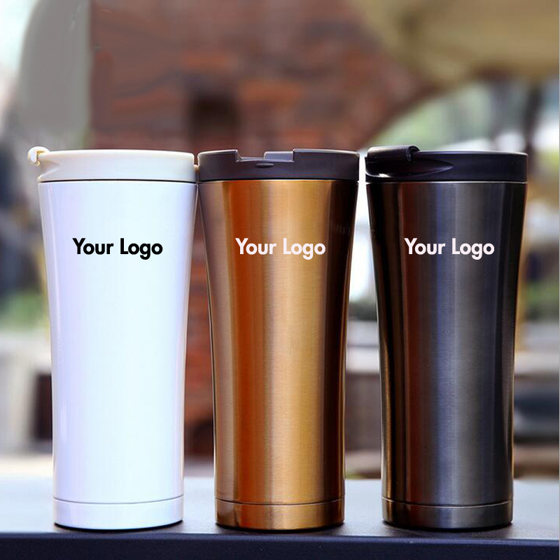 Starbucks type tumbler mug with flip lid, made from double stainless steel insulated wall, food grade material, BPA-free, nontoxic, Eco-friendly. Volume is 500 ml/18 oz. Insulation for optimal temperature, taste, flavor retention. Features a streamlined body, comfy hold, a leakproof, screw-on lid with flip sip and rubber padded base. Silicone gasket on the lid prevents messy spills and splashes. Fits most standard cup holders. Perfect promotional item, gift or souvenir.