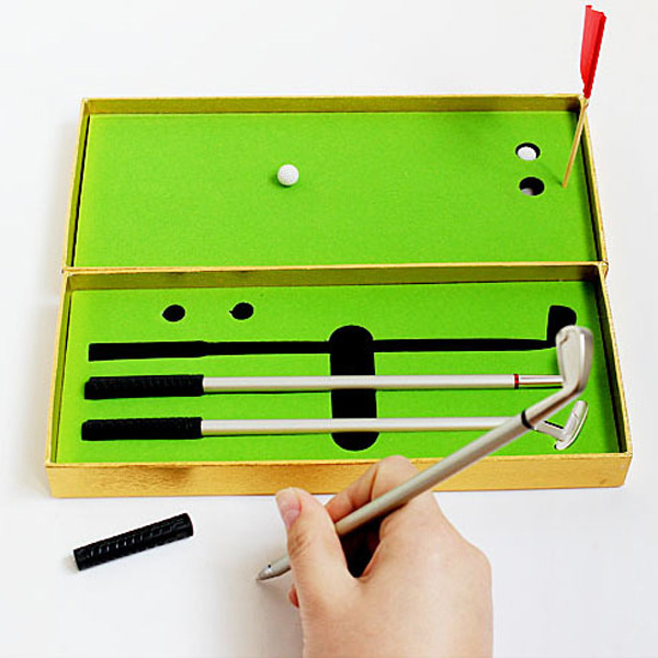 If you love golf, believe you also love this golf pen set. Including three metal golf club pen, and two mini golf balls, and the gift box is the golf course. You will needn't go to outdoor to play golf, in your office, home, and anywhere, you can carry this set to play golf, it will make your life have more happy. Your logo can be imprinted on golf pen or gift box, choose your love.