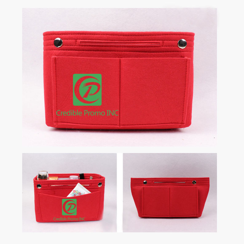 The felt bag has a slightly tapered shape, and is made from felt that can be hand-washed in water. Great for organizing inside and outside, with several open-top pocket inside and on the front outside and back side of the bag are wider pockets to hold items. Besides, this item could be inserted in a big bag which can help organizing. Logo is welcomed.
