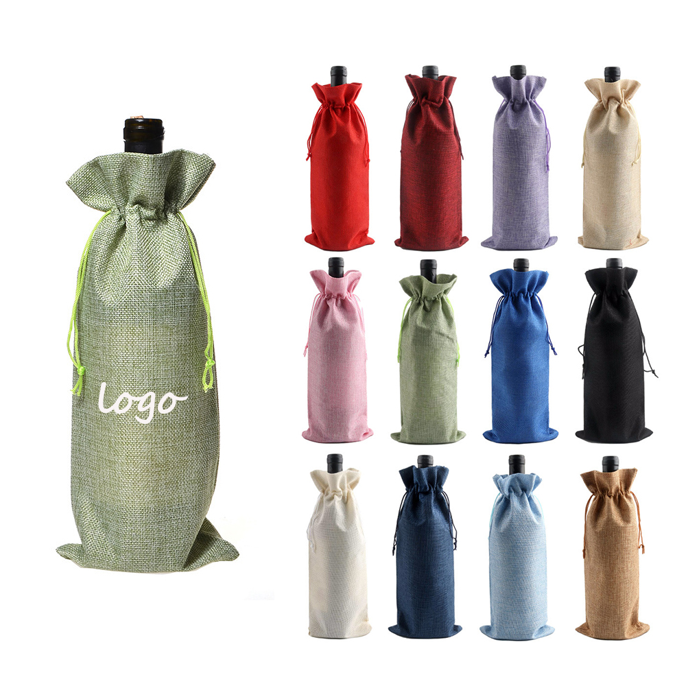 Natural burlap material makes this wine bag durable, reusable and eco-friendly. Measures 14 '' x 6 '' approx, can accomodate regular sized wine bottles and champagne bottles. Built-in drawstring makes it easy to open and close, covenient for wine bottle storage and other similar shaped gift wrapping and packing.