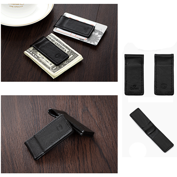 This money clip features black leather with a felt lining. A perfect combination of classic design, square corners, and smooth feel holds your cash securely.