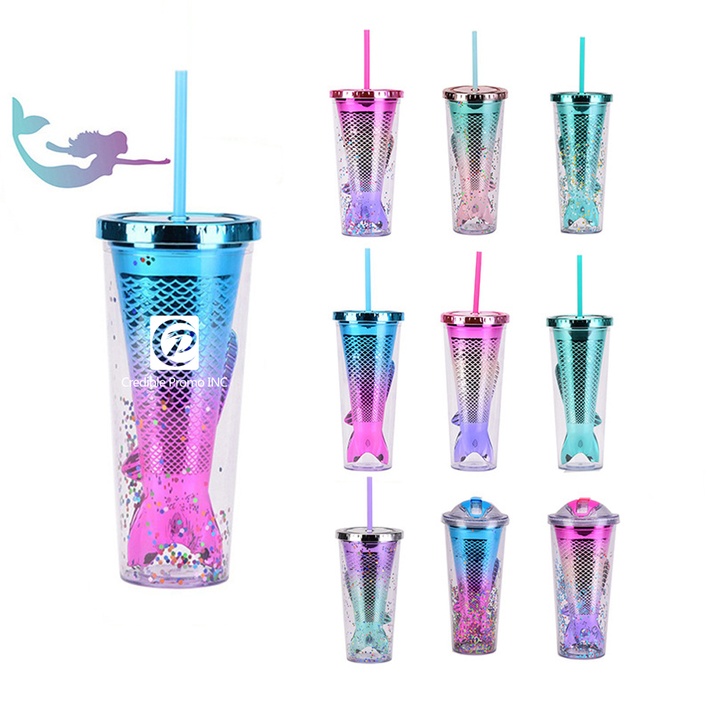 Use the clear plastic tumbler with Mermaid shape inside as a leak-proof tumbler for your favorite beverage or as an iced coffee cup. The tapered shape of this slim tumbler allows it to fit into most cup holders. This rainbow sparkly tumbler can be used in cars, at home, at the office, while camping, at the movies, and more.