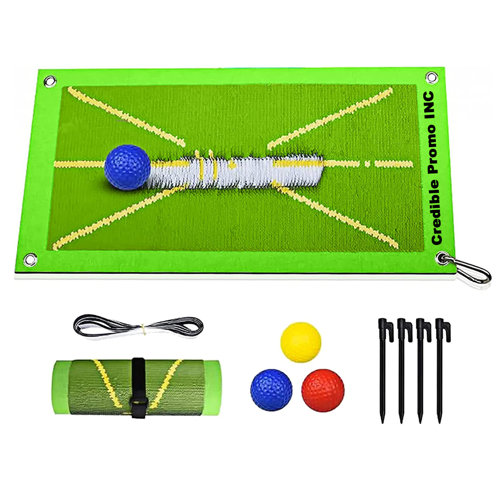 Our golf training mats can leave a swing path after hitting the ball, which can effectively analyze the landing point of the club. So that you can correct your posture and power in time. It's perfect for beginners looking to improve their skills. The package includes 1 mat, 3 different color golf balls, 4 pegs, velcro straps and climbing button carabiner.