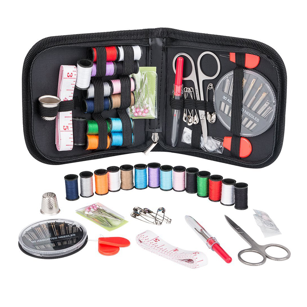 The kit contains all the necessary tools that are required for performing basic repairs - be it a scissor, threads (12 colors), assortment of sewing needles, shirt buttons, seam ripper, thimble, needle threader tools (two) and a foldable tape. Items won't fall out when you open the case, needles in separate closed box for safety, and other items securely tucked in place with attractive black elastic bands. Compact design making it convenient to carry in style anywhere you travel. Your LOGO or artwork can be imprinted on it.
