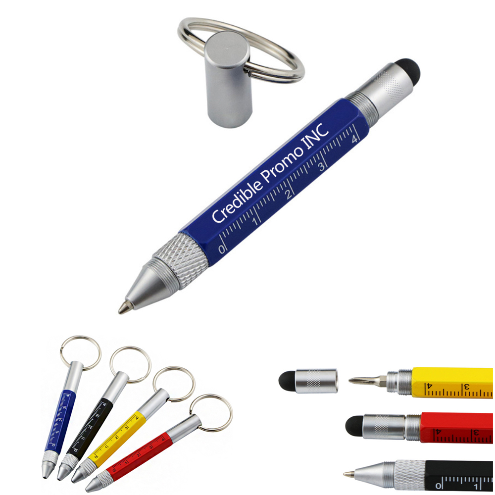 This tool pen was designed for easy use. Comes with 6 very handy functions: ball point pen, ruler, flat-head screwdriver, phillips screwdriver, stylus for touch screen, key buckle. Compact, portable design and elegant look. Your customized LOGO can be laser engraved on the pen body.