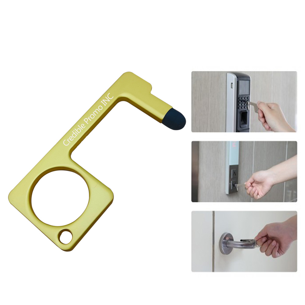 Non-contact door openers can help us avoid direct contact with public equipment, the front has a stylus point that can be used to press buttons on pin pads, elevators and light switches. Made of alloy. 72*32*4mm. Key ring is available.