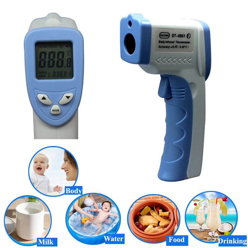 Non-contact infrared thermometer in handgun shape. High safety, high technology. Can measure baby's temperature without any touching. Nonradiation, Fast, Accurate and Handy. Use in body temperatue, water / milk / wine / liuid temperature, object surface temperature etc. Time to automatic shut down 8 seconds. Company LOGO is available.