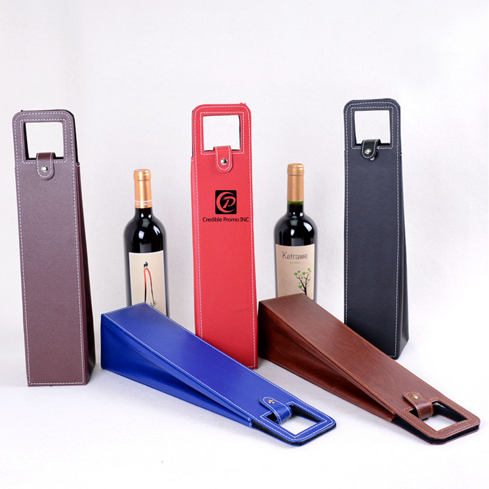 This leather wine bag is great for one wine bottle, it can be used over and over again and easy to put in and take out. Designed with a metal buckle on the top of the bag, it will enhance the security of wine bottle from crashing. This bag also has a large imprint area for deboss and Hot Foil stamping. 3.5"L*3.5"W*16"H