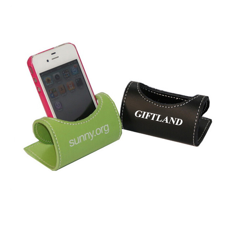 Folding Phone Holder. Made from Leather with a metal closure. Put your phone and this holder on your desk or dashboard,the phone's screen become visible.Great promotional item for the theme of Office, Phone, Car and so on.