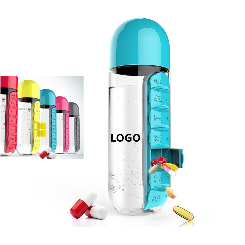 7 compartment removable pill organizer for each day of the week, great way to take your medication while on the way. Each compartment is clearly labelled in English, French and Braille (for those with impaired vision), so you can easily store and keep track of medication each day of the week. Lid has silicone washer to help ensure a tight seal with the bottle, and twist-off lid can work as a drinking cup. Your LOGO or artwork can be imprinted on the bottle.