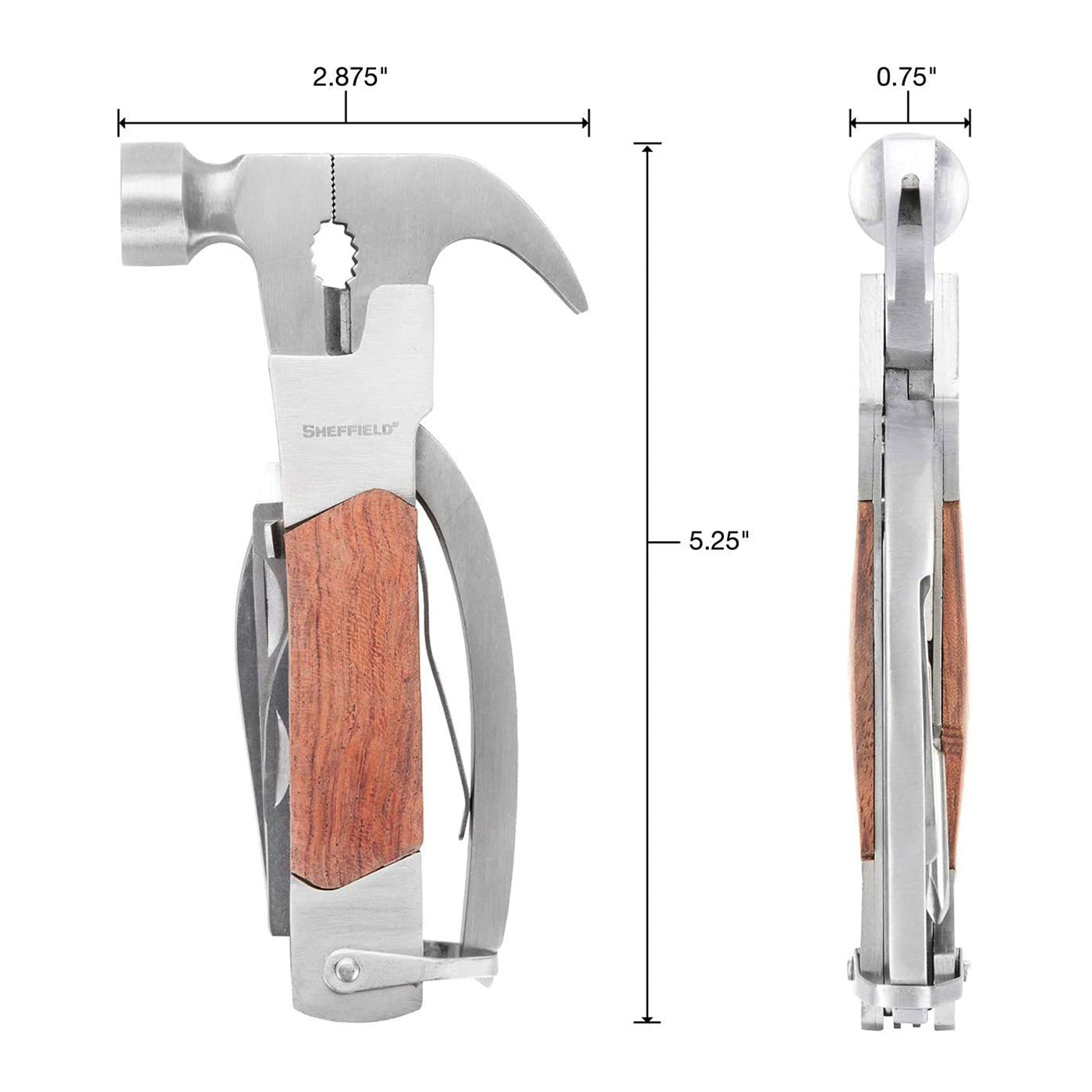 With 14 functions in 1, there’s no need to carry around a big bag of survival gear and equipment kit. Includes Hammer Head, Nail Claw, Pliers, Linesman Pliers, 1/4" & 1/8" Slotted Screwdrivers, #2 Screwdriver, 2-1/2" Drop Point Blade, 2" Serrated Blade, Bottle/Can opener, Wire Cutters, Wire Stripper, & Soft File. With a durable steel head and sturdy hardwood handle, this traveler multi tool for men and women is a must-have addition to anyone's camping gear and equipment; Our multi tool is compact enough for easy storage in your bag, survival gear, tool box, or workspace.