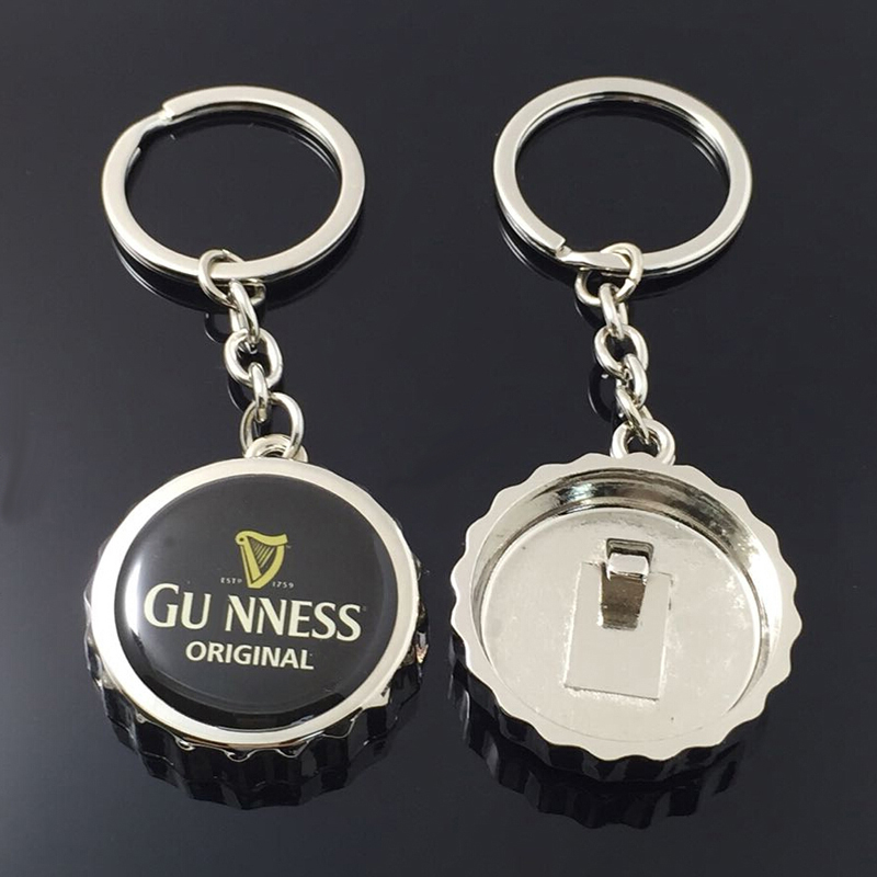 Bottle cap shape bottle opener with keychain, high quality, made from zinc alloy. Diameter 1 1/2". Solid metal construction for the opener. Affordable and long-lasting. Every household loves it ! Put your artwork on the epoxy sticker. Ideal for beverage, bottle, bar and self promos.
