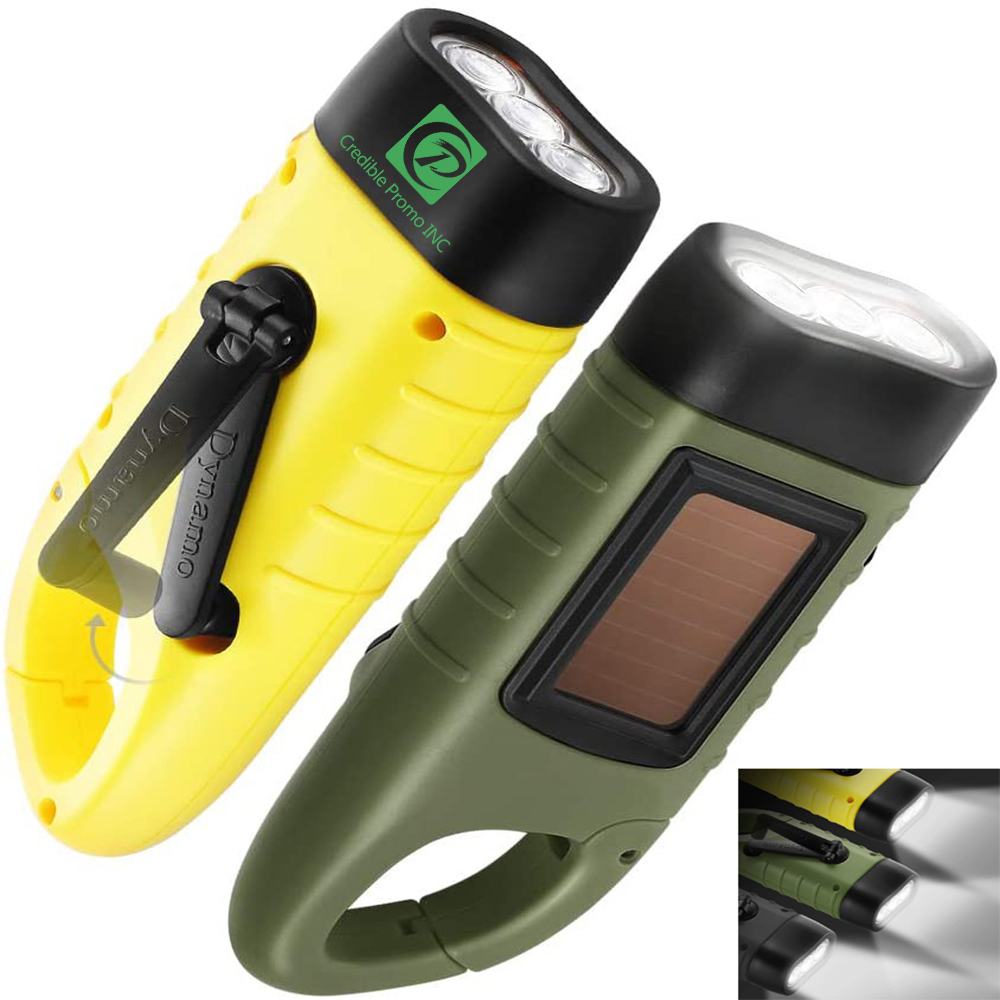 Built-in rechargeable battery, conveniently generates power for more than 10 minutes’ lighting by 1 minute's crank (basing one speed of two round per second). Solar panel as a back-up powering method absorbs all kinds of light, such as strong and medium sunlight, lamp light and more. Ergonomic and rugged design is comfortable and secure to grip in hand. Perfect for daily, emergency and outdoor lighting. The built-in durable carabiner securely clips to your backpack, ideal for outdoor activities.