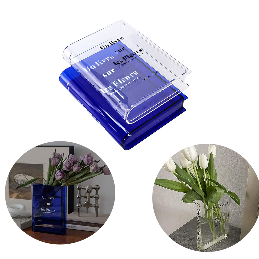 Book vase for flowers is known for its transparency, designed for book aesthetics is a beautiful and practical choice for displaying flowers in a variety of settings, from home decor to special events. Book shaped vase can be used in a variety of settings, such as home decor, office decor, bookstores, libraries, and events. They are a versatile and unique way to display books, making them both functional and decorative.