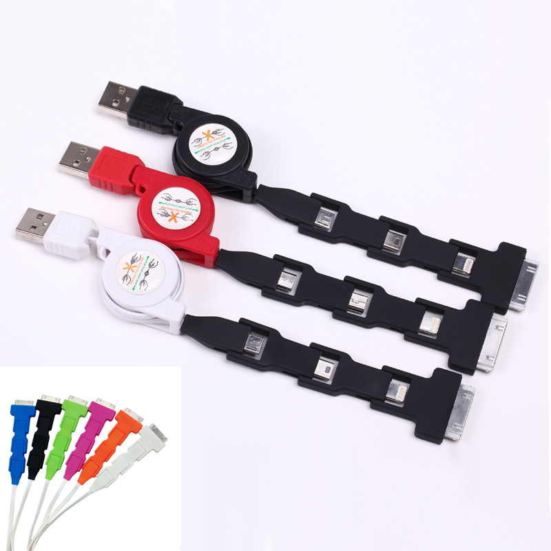 Retractable 4 in 1 data cable/data wire. Each interface can be fold easily. Cable length can be stretched to 33 inches. Including 4 interfaces: 8 Pin (for i phone 5), 30 Pin(for I phone 4 and I pad), Micro PIN (for tablet PC,GALAXY TAB,SAMSUNG phones,HTC phones and so on), Mini Pin(for some old phones and cameras). Each port can be used to charge power or transmit data. Your customized LOGO can be imprinted on the middle of retractable roller.