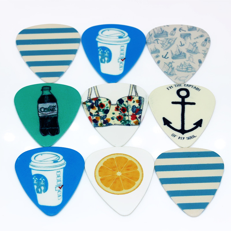 Size: about 1.2"x1". Thickness: about 1mm. Universal and Suitable for both acoustic and electric guitars. Cool guitarpicks, lightweight, extremely durable and pleasant to your fingers. Celluloid material, providing a natural feel and warm, fat tone. Classic guitar pick shape with unique pattern for comfortable playing.