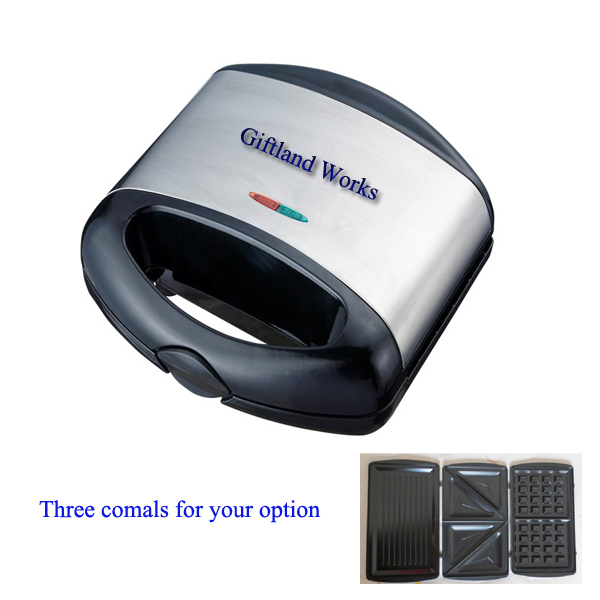 Waffle or sandwich maker, three comals for your option. Non-stick hinge and cooking surface, easy cleaning;Cool touch housing provides extra safety; Slide-resistant feet, power light and ready light; stand upright for compact storage. Your LOGO can be imprinted on the outside surface.