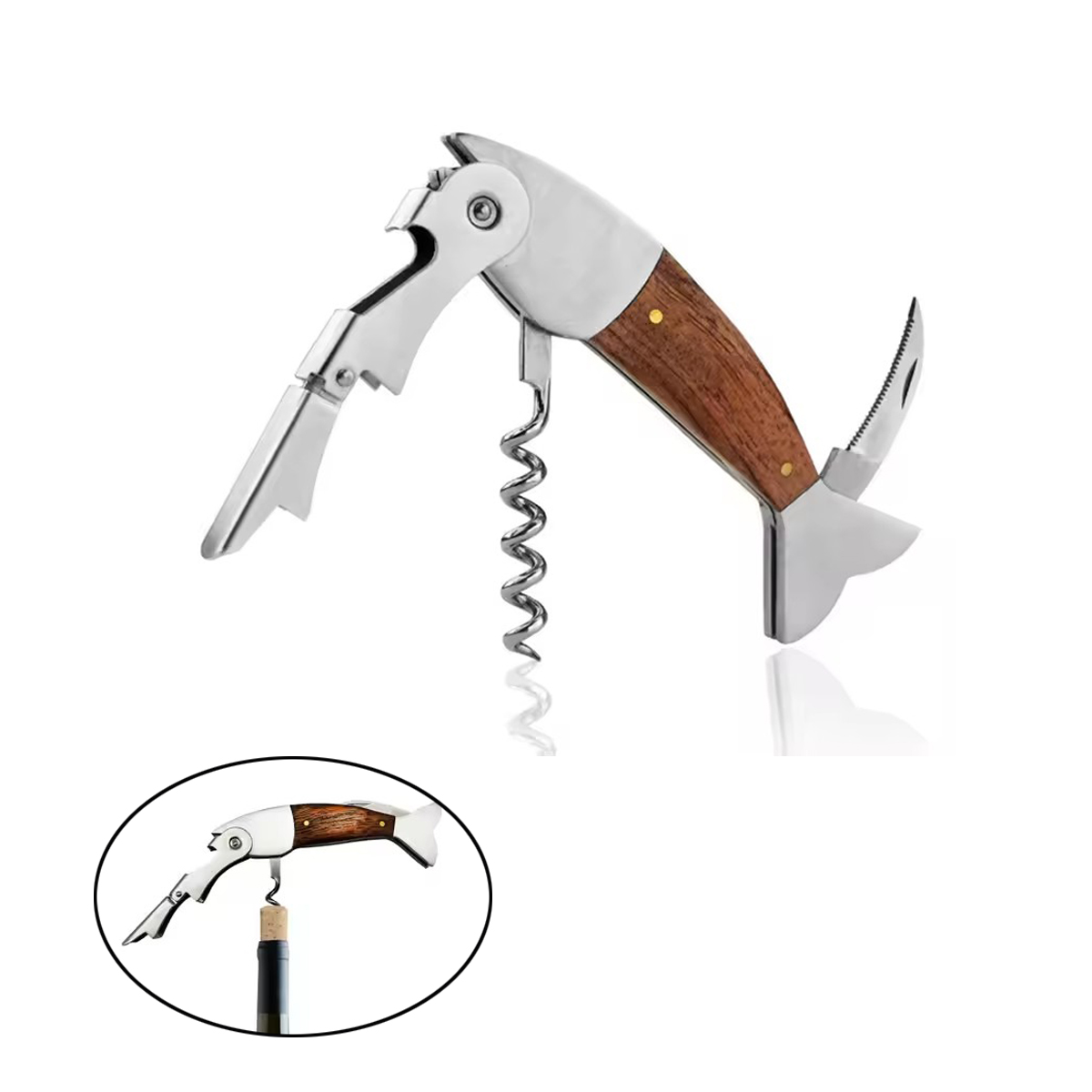 Fun fish shape. Stainless steel with white oak wood grip. Features corkscrew, foil cutter and bottle opener. Measures 5-inch long.
