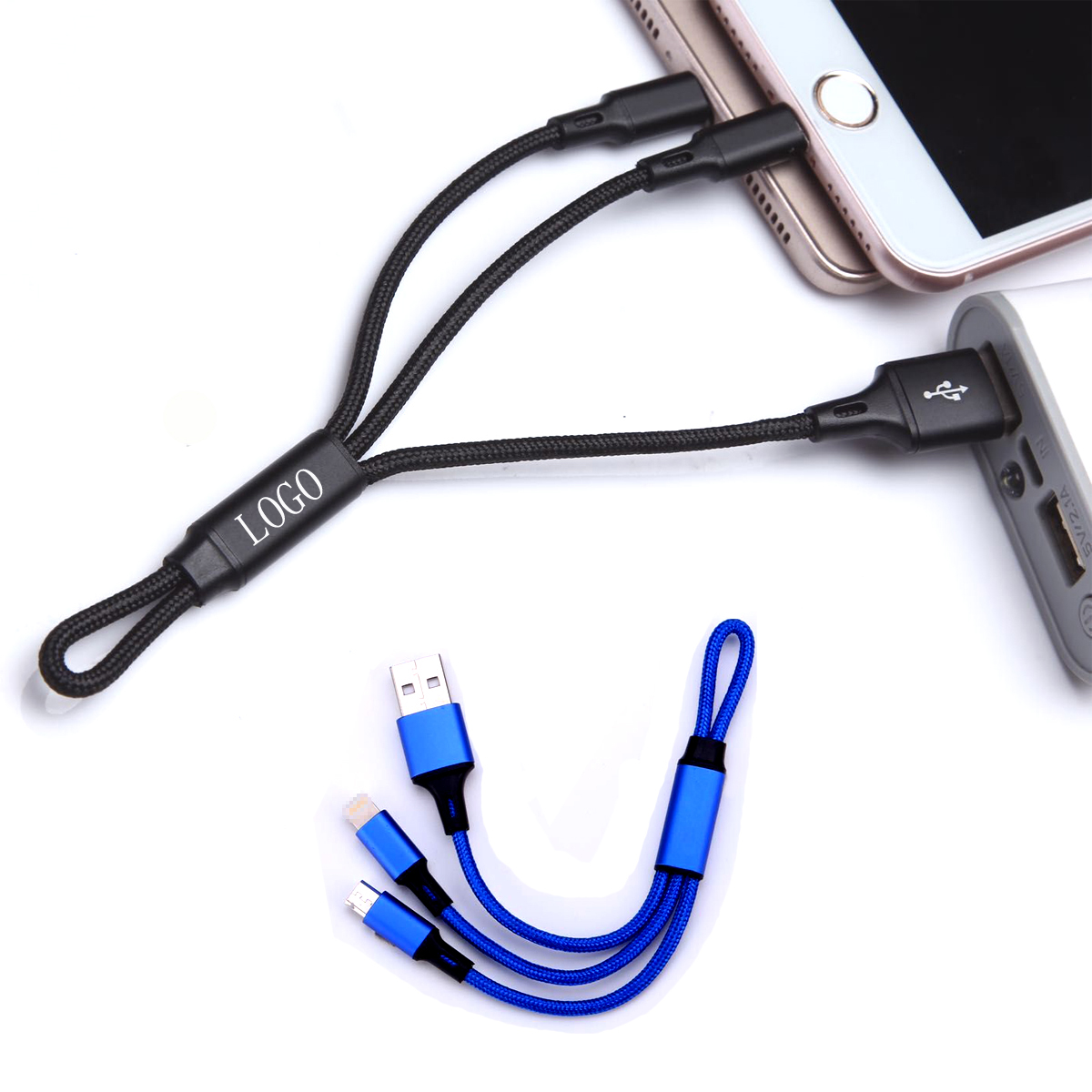 Weave nylon braided multi phone charging cable with keychain. Made from braided nylon or woven material, anti knotted, durable and compact. Length 6 1/4 inches. Charge your phone at anywhere and anytime with this charging cable. Suitable for IOS system (8Pin plug for I5/I6/I7/I8), Android system (Micro plug for Sam Sung phones, other phones and other digital devices). Great promotional item for digital and travel theme.