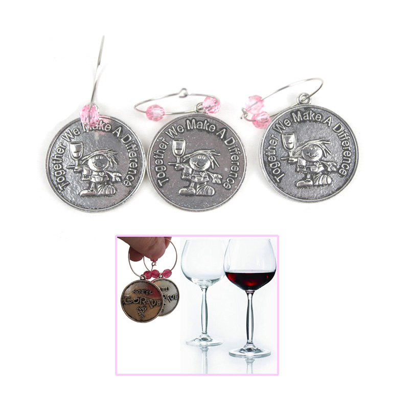 Custom Metal Wine Charm, comes with colored beads. Size is 1 1/8" diameter. As a perfect gift, wine charm is very popular for company parties, benefits, charity dinners, grand openings and so on. It can identify yours from others easily.