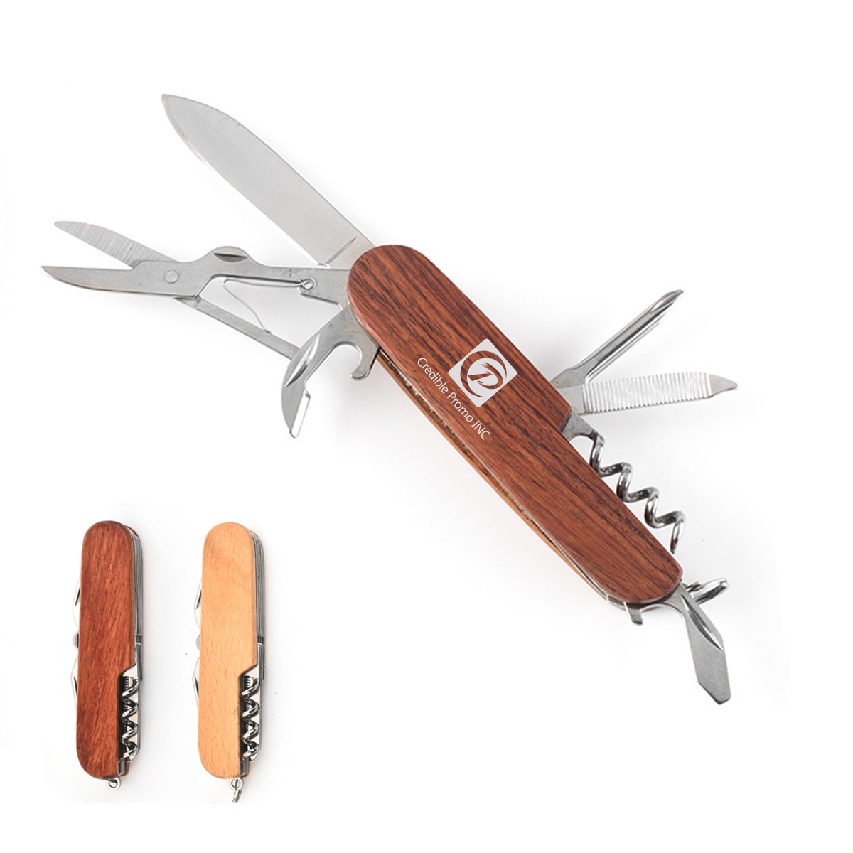 Made of stainless steel and natural wood. Bring this knife with you on your daily adventures without sacrificing space. It makes a great gift for any occasion or stocking stuffer for Christmas. Inclued large blade, small blade, can opener, screwdriver, pulling cork drill, hole drill cone, file, nail drill, Phillips screwdriver, scissors, wood saw, key ring. Your logo is available.