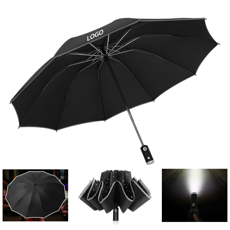 | Feature : | 3 Folding Auto Waterproof Led Umbrella Light 10 Ribs Reflective Safety Tape With Flashlight Handle |