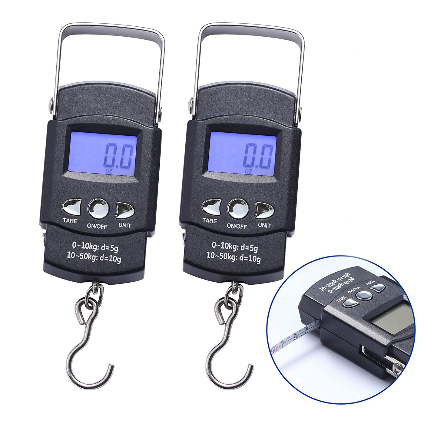 Our Digital Fish Scale with Tape Measure can weigh up to 110lb / 50kg. The sturdy stainless steel hook at the bottom of the hanging scale can easily lift up luggage or big fishes so you can know their weights right away. You can press the Unit Change Button to switch the weight unit between kg, lb, market pound and oz. Each scale has a 3.28-foot tape measure for you to use, featuring a back-lit LCD display, memory function, Auto-Off after 5-seconds of non-use to save battery life.