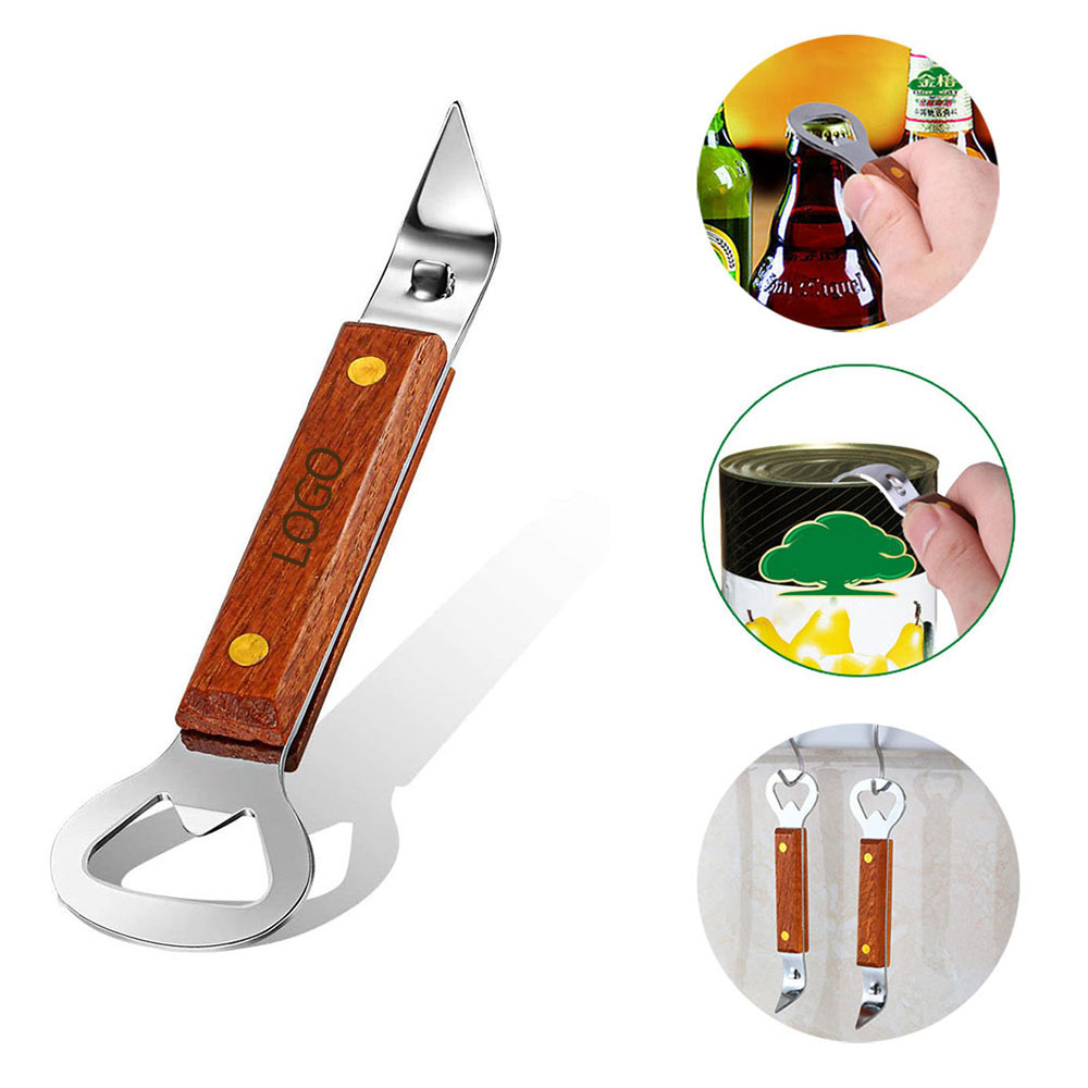 The can bottle opener has two tough stainless steel heads, allowing users to open cans and bottles quickly and easily. The non-slip wood handle feature a smooth surface, will not hurt your hands. It is characterized by 2 different sides including a bottle opening side and a can opening side. It can be tucked into tool bags easily, occupies little space, provides convenience to carry, and loop design allows you to hang from after use.
