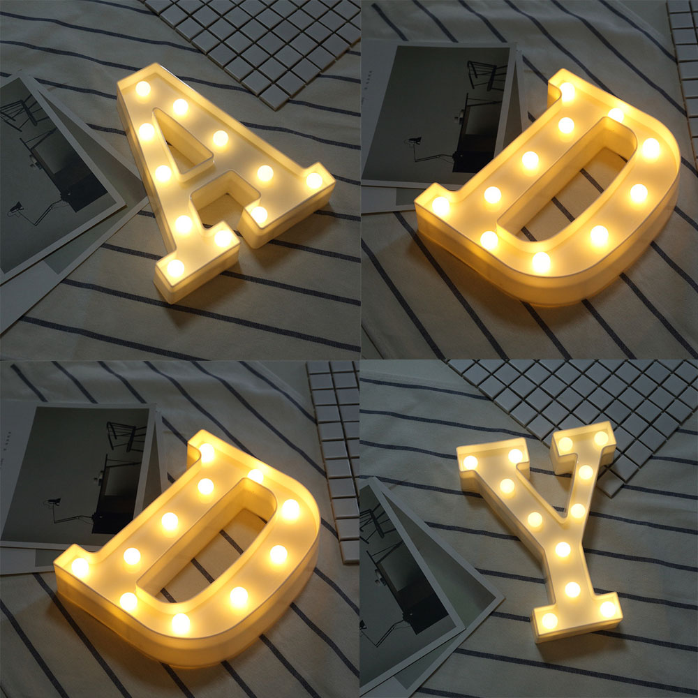 Lighted marquee letters covered with shiny golden decoration or monochrome white, giving a bright eye catching glow, perfect for gold party decorations, anniversary, graduation, bachelorette party, birthday, bridal shower, baby shower and wedding decor. Each led letters lights alphabet is powered by 2 AA batteries(not included). Dimension: 8.86"(H)*1.77"(D), each letter is designed with different width. Please consult us for detailed dimension.