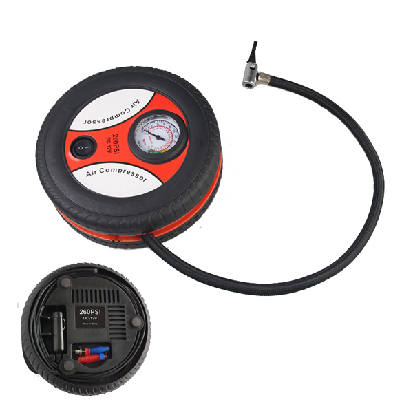 Auto tire shape air compressor, with air tube 50 cm/19.5" and electric cable length 3 meters. Item size is diameter 6.9" X height 2.5". It is suitable for all kinds of automobiles. You don't need be panic if your tire is deflated on halfway. The working voltage is 12V and the current is over 10A. Logos can be printed in the middle of the tire by sticker.