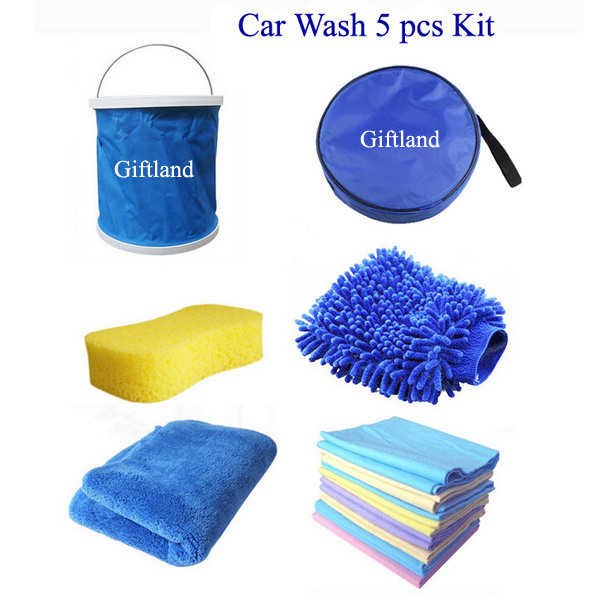 Portable car wash kit. Including 1 pc foldable waterproof bucket 11L, 1 pc microfiber towel, 1 pc fake chamios towel, 1 pc sponge brush, 1pc microfiber coral golve, and 1 pc packing nylon bag. Your customized LOGO can be imprinted on the outside of bucket or kit bag.