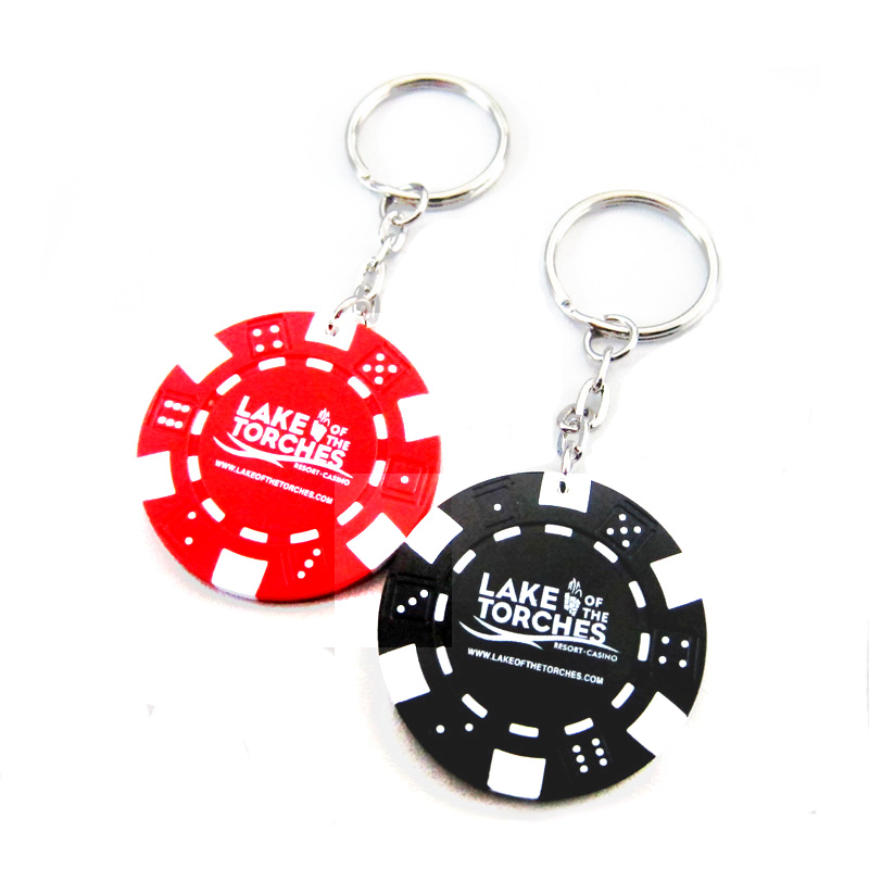 This casino-weighted poker chip keychain. Size is diameter 1 5/8", made from ABS. This item is perfect for casino's promotional events. Your LOGO can be imprinted on one side or both sides.