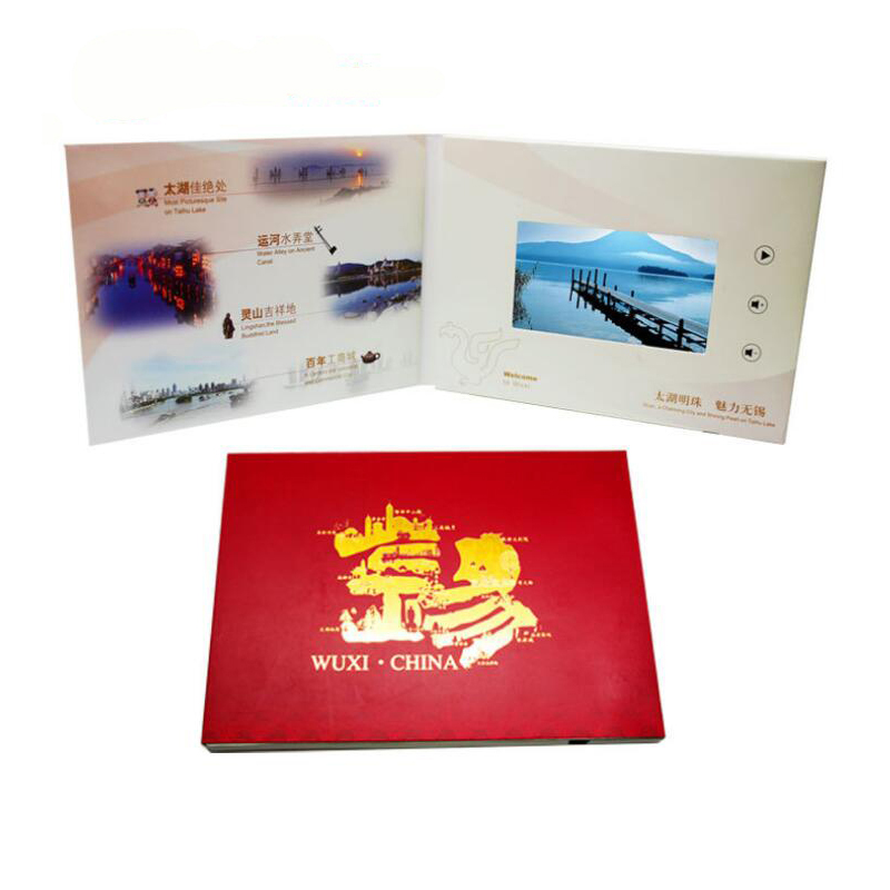 This video will play automatically once you open the book. Speaker and rechargeable lithium battery in it, magnetic closure design. Both button and without button are available. We can make the LCD screen vertical or horizontal in the brochure. For the screen, we have size 2.4", 4.3", 5", 7", 10". For the inside memory card, we have 128MB, 256MB, 512MB, 1GB, 2GB, 4GB for your option. Video brochure is very suitable for all kind of Festivals, Gift, Promotion, Birthday, Christmas, Father's day, Mother's day, Thanksgiving day, New Year, Invitation, wedding, Business gift etc. This price is based on 4.3 Inches screen, A5 brochure size, 512 MB memory card, 5 buttons design. Welcome to inquiry us for your different requirement!