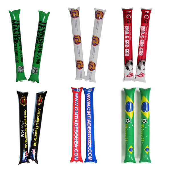 Inflatable Cheer Stick, ECO-friendly PE material. Non-toxic, it can be recycled and reusable. Easy to carrying and easy to using, children can using it. Usage: advertising, celebration, promotional, Sports events, Vocal Concert, FIFA World Cup,etc. Normally 24"×4", or customized. 1 pairs + straw in opp bag. Any shape by your design.