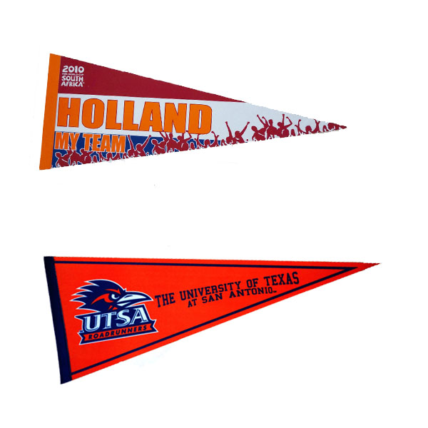 Pennants are a classic, fan favorite promotional item. Commemorate a special event or sports team with these colorful felt flags imprinted with a high quality heat cured ink for long lasting resistance. A sewn-on edge strip coordinates with your imprint color and holds an optional pennant stick. Price includes a one-color on one-side heat transfer imprint.
