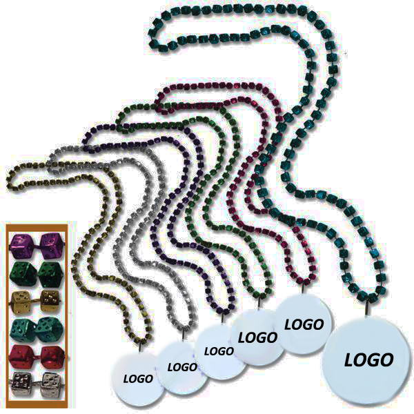 Keep your marketing campaign on a roll with this fun party accessory! Features 6mm dice-shaped beads on a 33" strand necklace with an assortment of colors from which to choose. Add your custom imprint to the white 2 1/2" medallions then hand them out during charitable functions or use as decorations in a home or office. Ideal for casinos, school fundraisers and campus bookstores!
