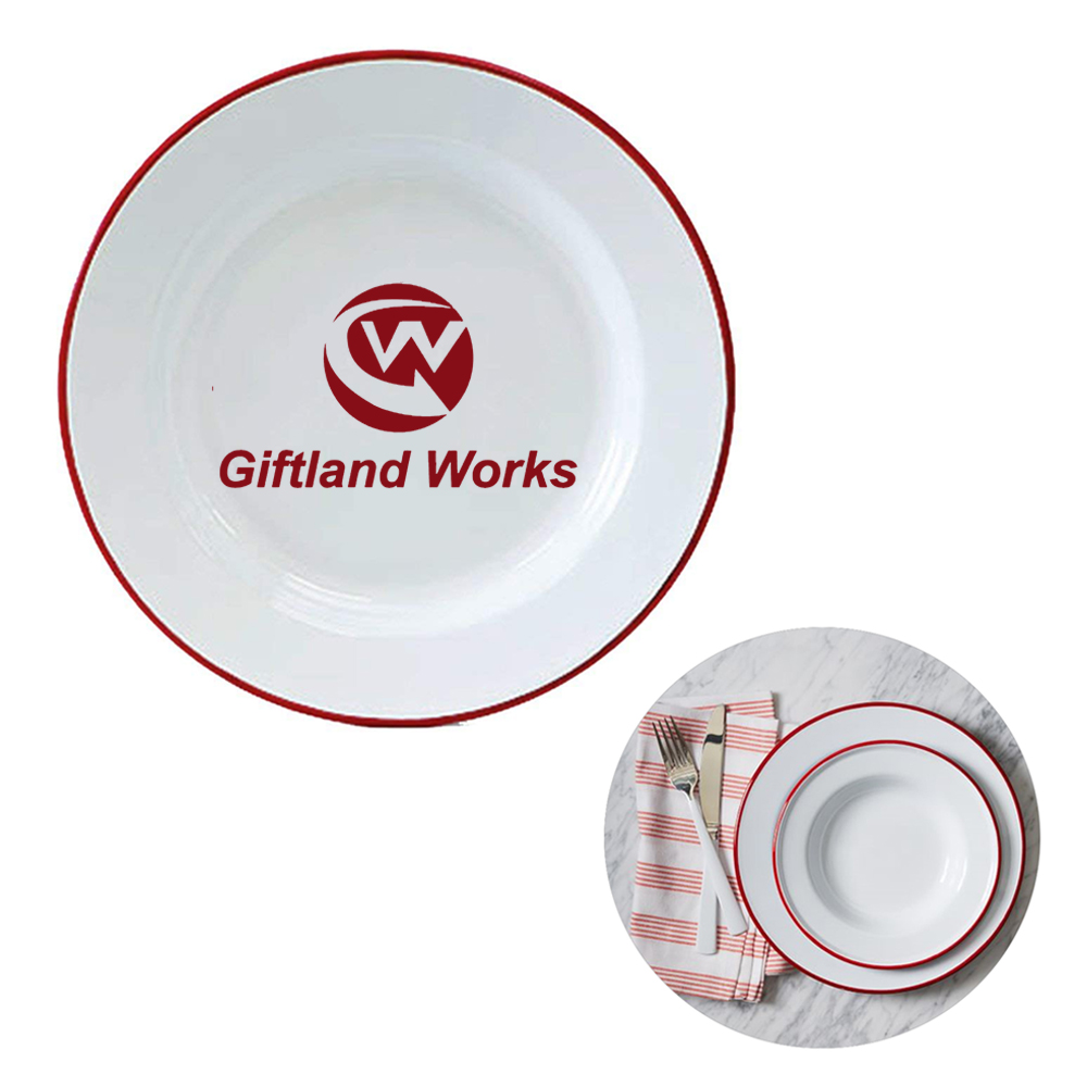 These versatile and durable enamelware plates brighten up both your kitchen and your daily routine. Enamelware is made from high quality carbon steel and coated with porcelain enamel in a two coat process that results in a slightly textured surface. The porcelain finish is baked on for easy-to-clean convenience, and the heavy-duty enamelware won't shatter like glass or break like a ceramic mug. This dinner plate is protected by a stainless steel rim that also serves to enhance its appearance. Your LOGO or artwork can be imprinted on the plate.